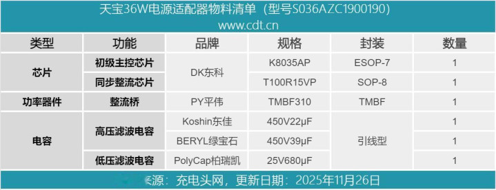 最后附上天宝36W电源适配器的核心器件清单,方便大家查阅。