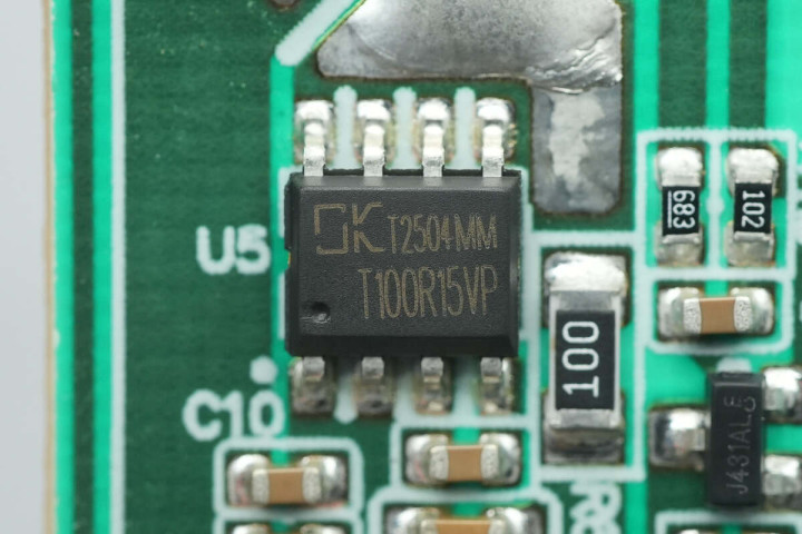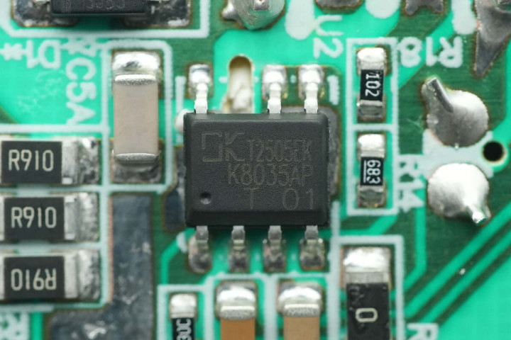 开关电源主控芯片来自东科半导体,型号K8035AP,这是一款高度集成了700V/600mΩ GaN HEMT的准谐振反激控制AC-DC功率开关芯片。K8035AP检测功率管漏极电压,当其达到最低值时开启功率管,从而减小开关损耗并改善电磁干扰。