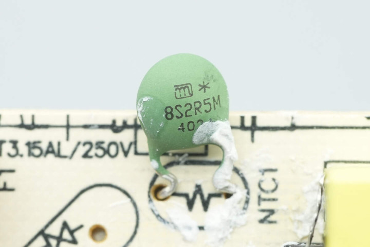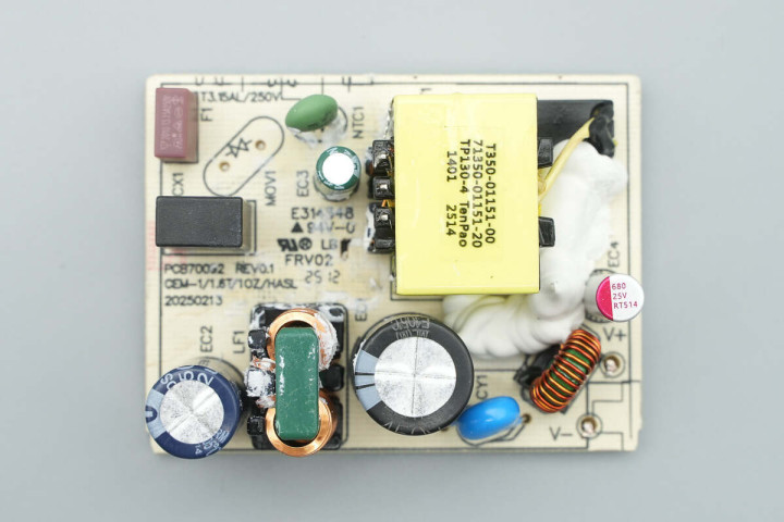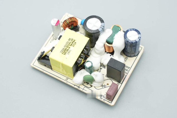 将初级侧白胶清理掉,主板正面设有设有延时保险丝、NTC热敏电阻、安规X2电容、共模电感、高压滤波电解电容、主控芯片供电电容、变压器、Y电容、固态滤波电容以及滤波电感。