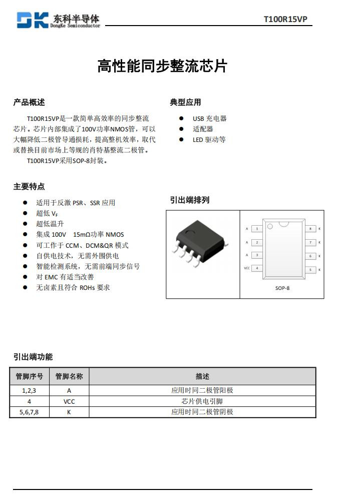 东科半导体T100R15VP是一款简单高效率的同步整流芯片,其内部集成了100V功率NMOS管,可以大幅降低二极管导通损耗,提高整机效率,取代或替换目前市场上等规的肖特基整流二极管,采用SOP-8封装。