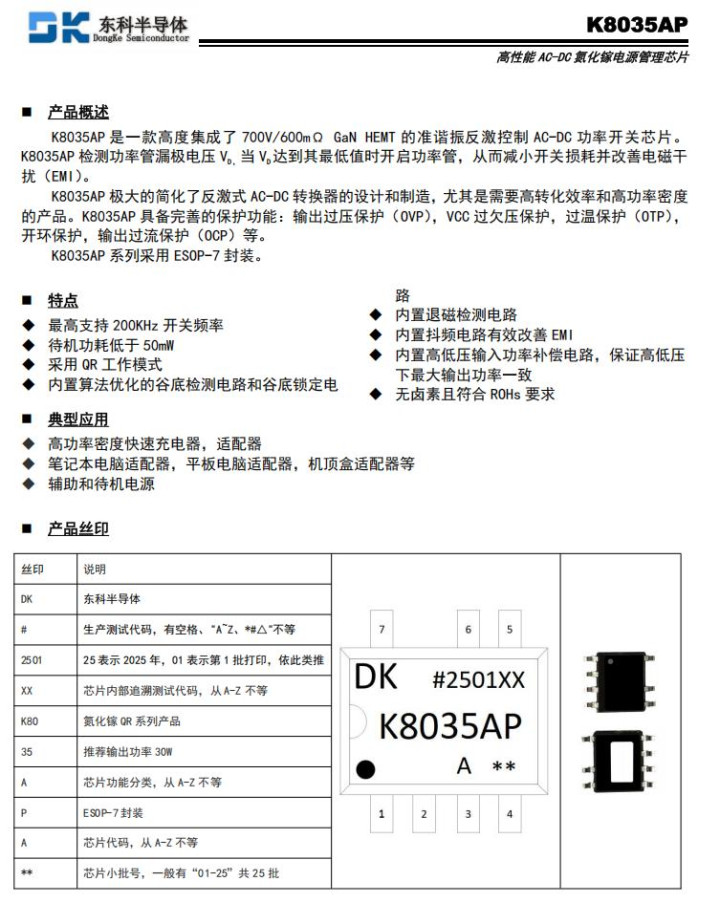 K8035AP极大的简化了反激式AC-DC转换器的设计和制造,尤其是需要高转化效率和高功率密度的产品。K8035AP还具备完善的保护功能:输出过压保护(OVP),VCC过欠压保护,过温保护(OTP),开环保护,输出过流保护(OCP)等。 K8035AP系列采用ESOP-7封装。