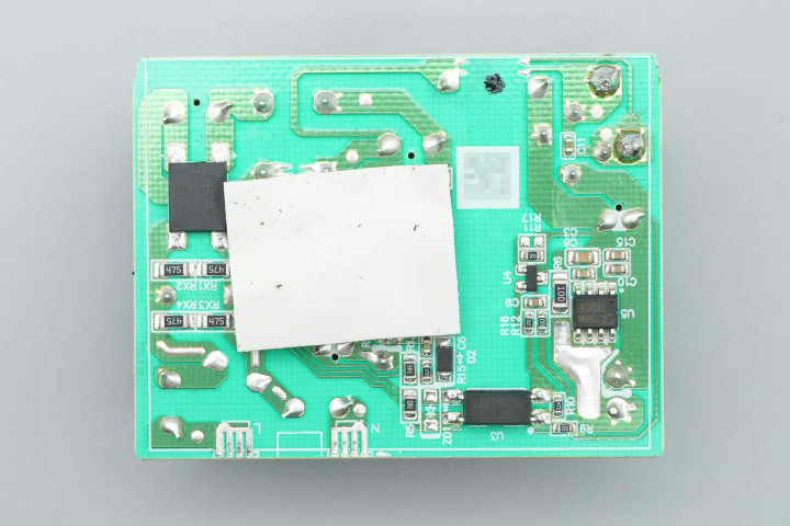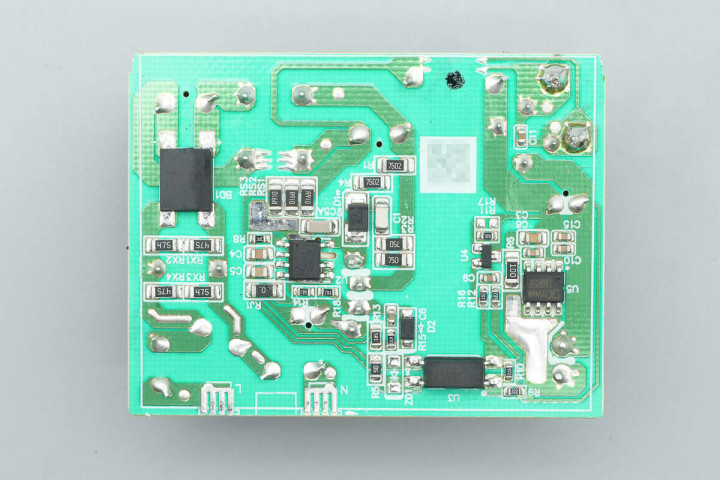背面设有整流桥、初级主控芯片、光耦和同步整流芯片。