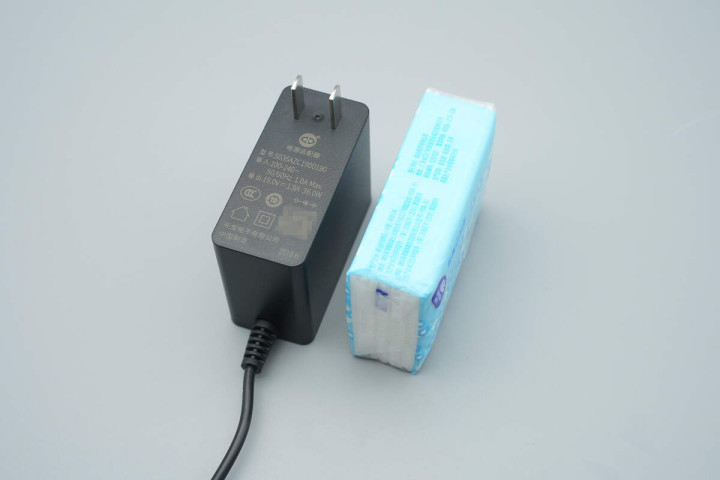 电源适配器机身比纸巾包还要小一些。